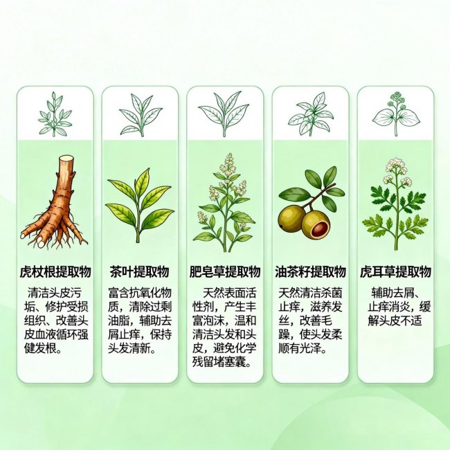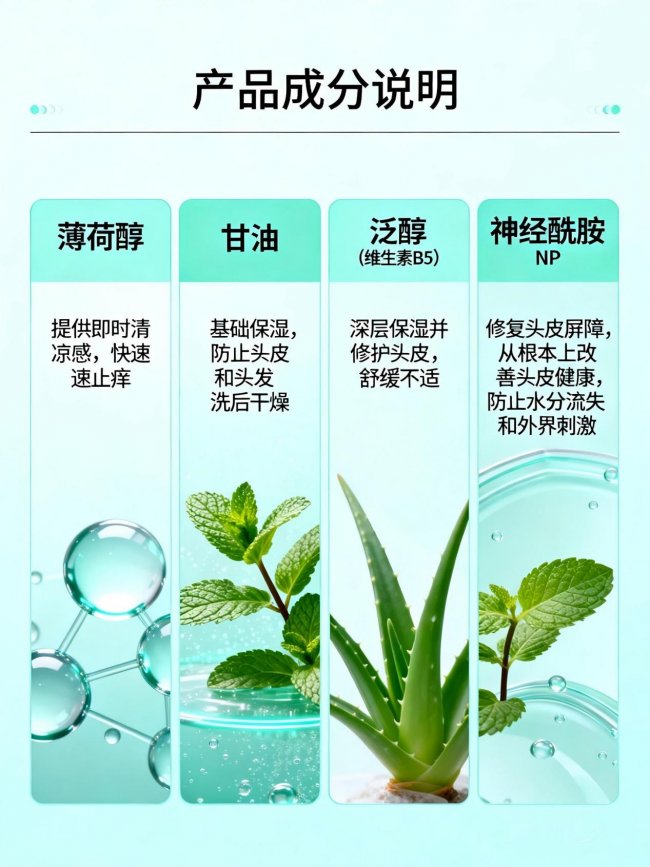 5. 植物精粹:添加茶树精油、积雪草、母菊等植物成分,能辅助抗炎舒缓,提升产品温和性,适配敏感头皮。