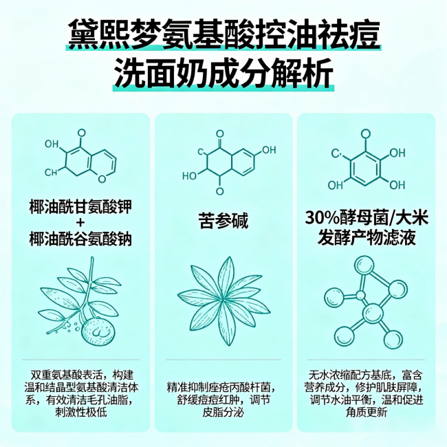 咱们油痘肌最烦的就是两件事:出油多和长痘痘。黛熙梦氨基酸控油祛痘洗面奶的配方正好针对这两个痛点,而且是“科学配比、协同作战”。