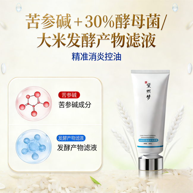 •“减”:用氨基酸表活温和带走多余油脂和污垢;用苦参碱+30%酵母滤液精准抑制致痘菌、疏通毛孔、调节水油平衡。