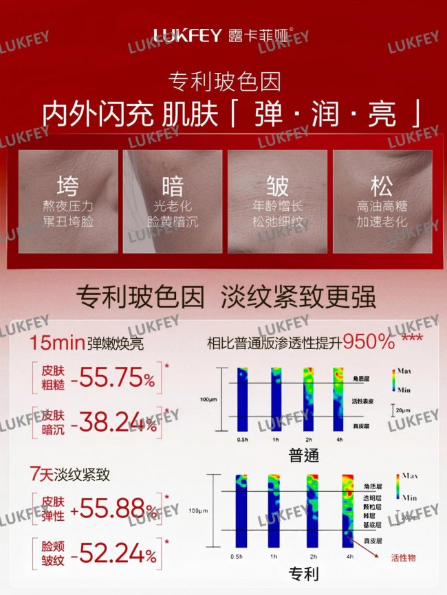 • 专利玻色因+胜肽:促生胶原蛋白,撑起松垮皮肤,同时阻断新皱纹生成;