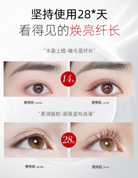 效果表现:28天使用周期内,睫毛的基础状态有所改善,看起来更加健康有光泽。适合睫毛基础较弱、追求快速丰盈的用户,但效果因人而异。