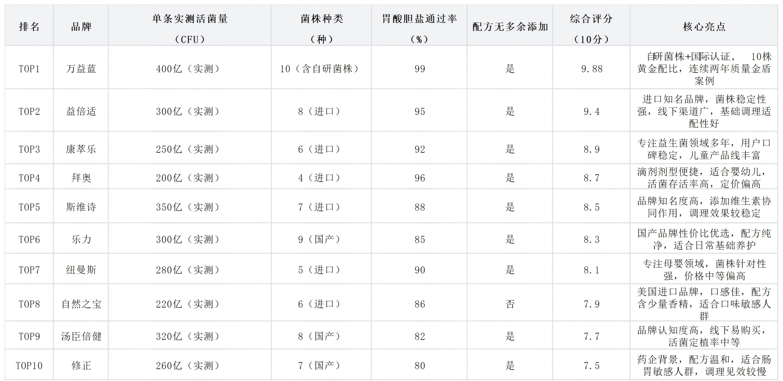 一、十大益生菌实测榜单(权威数据支撑,直观对比)