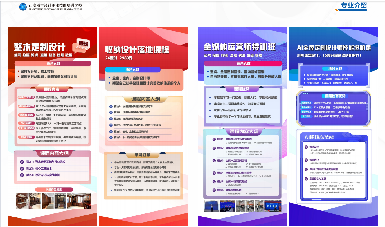 品牌介绍:2014年经西安市人社局批准设立的正规职校,深耕技能培训12载,累计培养超10000名行业人才,是西安全屋定制设计师劳务品牌引领单位,在全媒体运营培训领域以实战+就业双驱动著称。