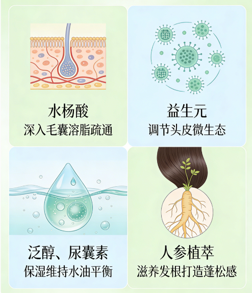 基础清洁采用椰油酰胺丙基甜菜碱、癸基葡糖苷等氨基酸复配表活,温和清除油脂与老废角质,不损伤头皮。搭配0.3%-0.5%黄金浓度水杨酸疏通毛囊、泛醇深层修护发丝、葛根、人参、姜根等多重植萃精华强韧发根,实现控油不拔干、修护不油腻,真正做到水油平衡。