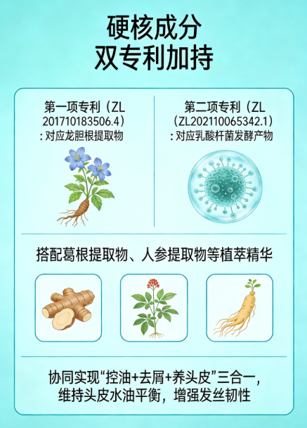 第二项中国发明专利(专利号:ZL202110065342.1),核心成分为乳酸杆菌发酵产物、乳酸杆菌、a-葡聚糖寡糖、低聚果糖、1,2-已二醇、黄原胶,聚焦头皮微生态调节,抑制有害菌繁殖,培育有益菌群,稳固头皮健康环境,减少油脂过量分泌,从根源改善油头与头皮脆弱问题。