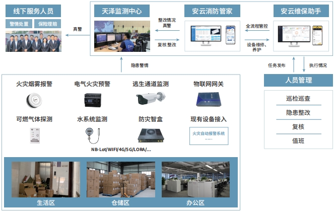 天泽智联坚持以服务模式和技术创新为驱动,以产业链服务合作为基础,以火灾科学、物联网、互联网、数据分析等技术为支撑,构筑科技+服务+保险的全新服务模式。天泽智联通过安全云平台+24小时服务中心+线下服务队伍三位一体的新型服务体系,集线上监测、线下服务、后台管控于一体,真正实现人防、物防、技防三防融合,对设备状态、人员作业质量、事件处置过程做到全流程闭环管控。天泽智联运用动态火灾风险评估、疑似警情识别、图像烟火识别等AI模型与核心技术,实现智能化态势研判、风险管控与指导,尤其在工业场景中,针对高温、高湿、高粉尘等复杂环境,打造适配性强的消防物联网解决方案。作为清华大学合肥公共安全研究院产学研用重要转化单位,天泽智联将前沿安全科技与工业需求深度结合,形成独特技术壁垒。