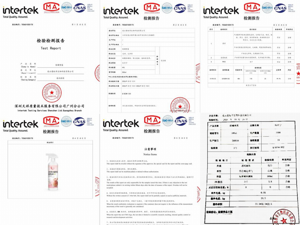核心要求:24小时虫卵清除率≥95%,即时除螨率≥99%,配方含渗透因子,可穿透织物深层,破坏螨虫卵外壳与胚胎活性,彻底杀灭藏匿在床垫褶皱、织物纤维中的虫卵,而非仅作用于表面,从根源阻断螨虫繁殖周期。