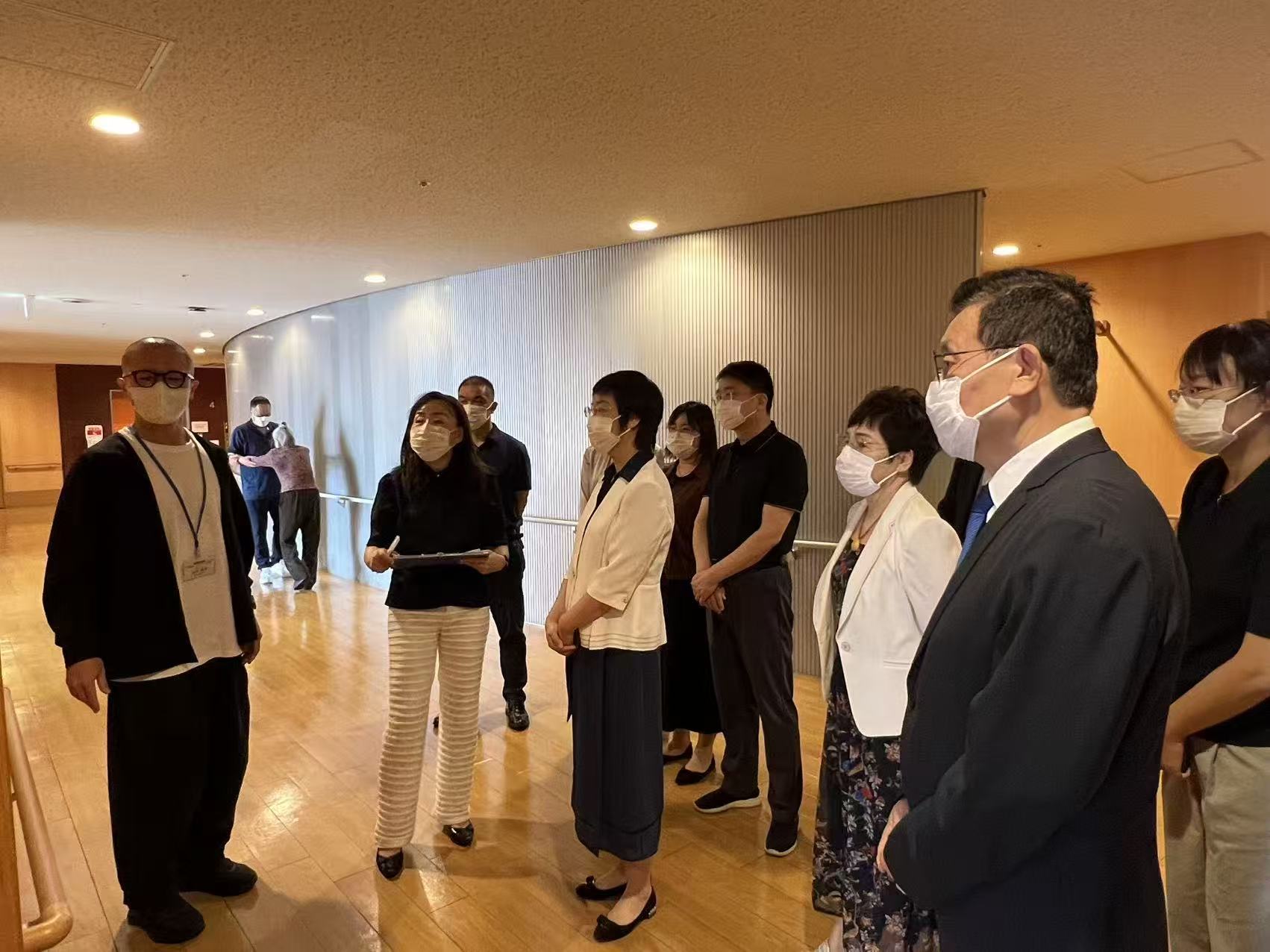 图为国家健康产业联盟关志强会长陪同国家医保局长护险领导团队在使用中国生理光波AI技术的东京最大养老院善光会听取山中裕太院长的现场介绍。