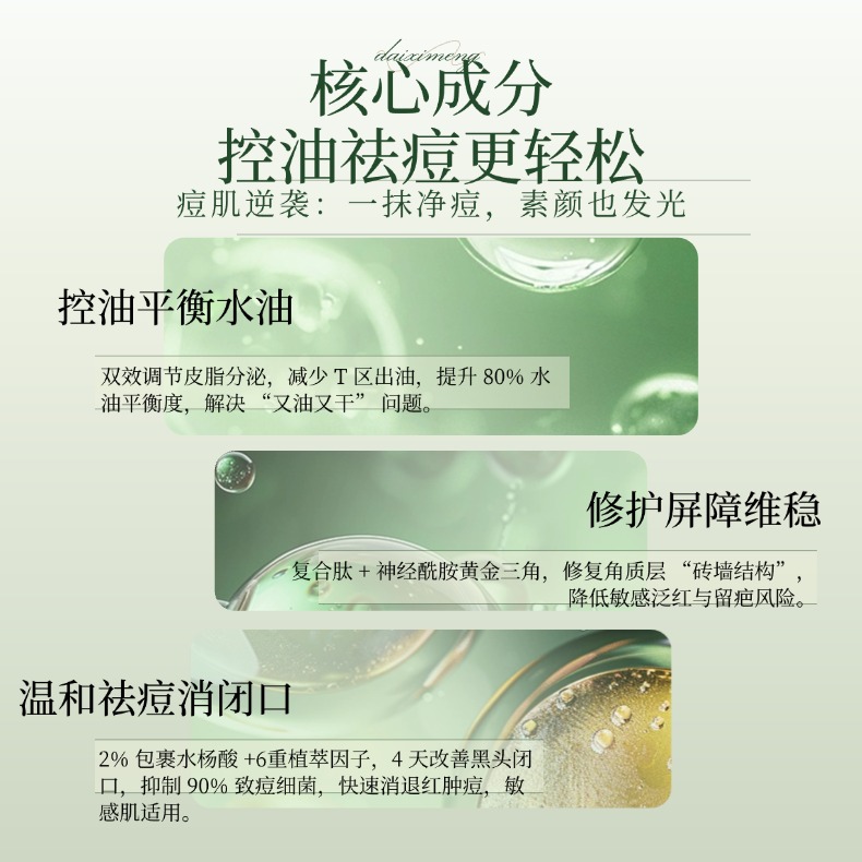 咱们长痘的人都懂,脸上面临的问题从来不是单一的:毛孔堵死长闭口、炎症泛红冒红肿痘、细菌滋生让痘痘反复烂脸、屏障受损还越护越敏感,这四大难题凑在一起,普通单一成分根本扛不住。而黛熙梦净颜祛痘焕肤精华液,完全是照着这些痛点精准搭配成分,不是随便堆砌,而是每一组都强强联手,效果直接翻倍。