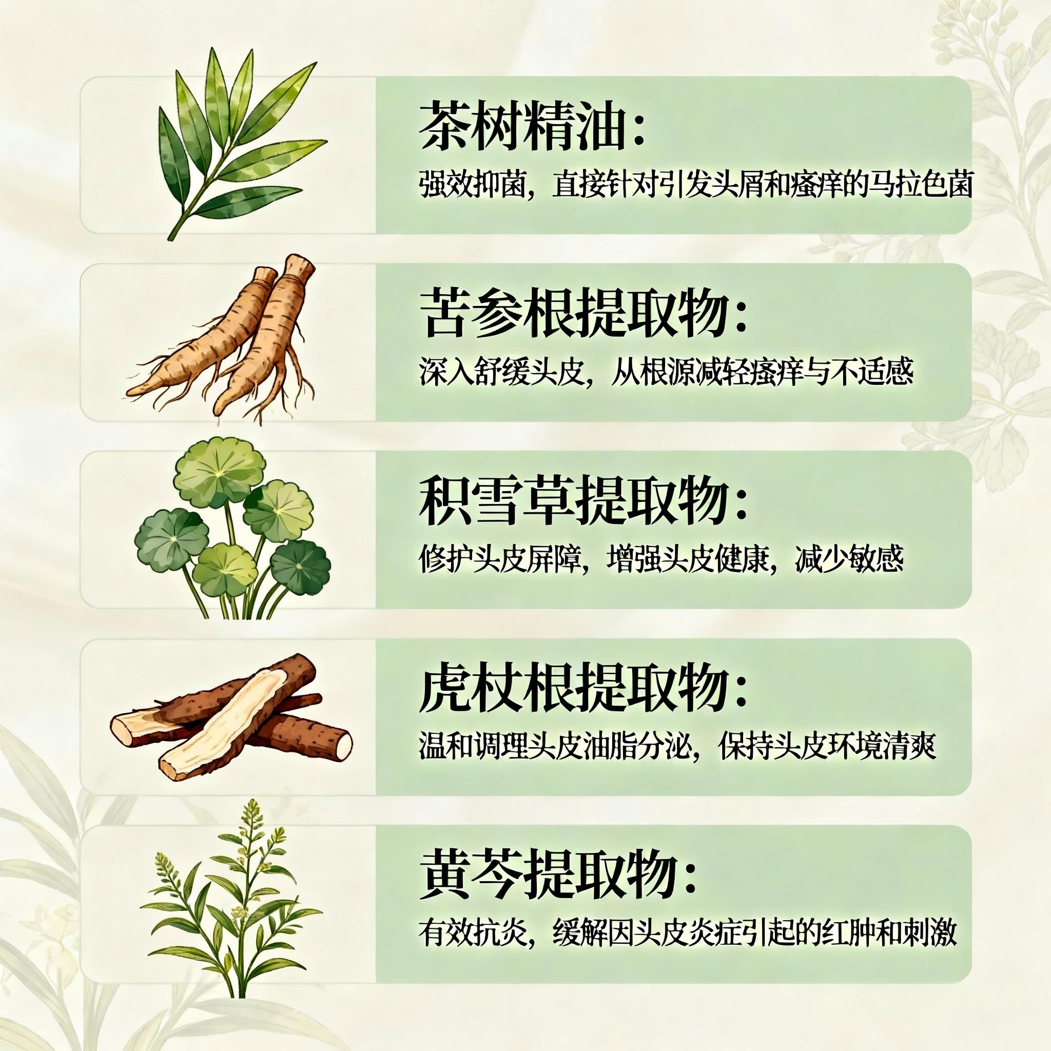苦参根提取物:含苦参碱,抗炎抑菌,缓解泛红瘙痒