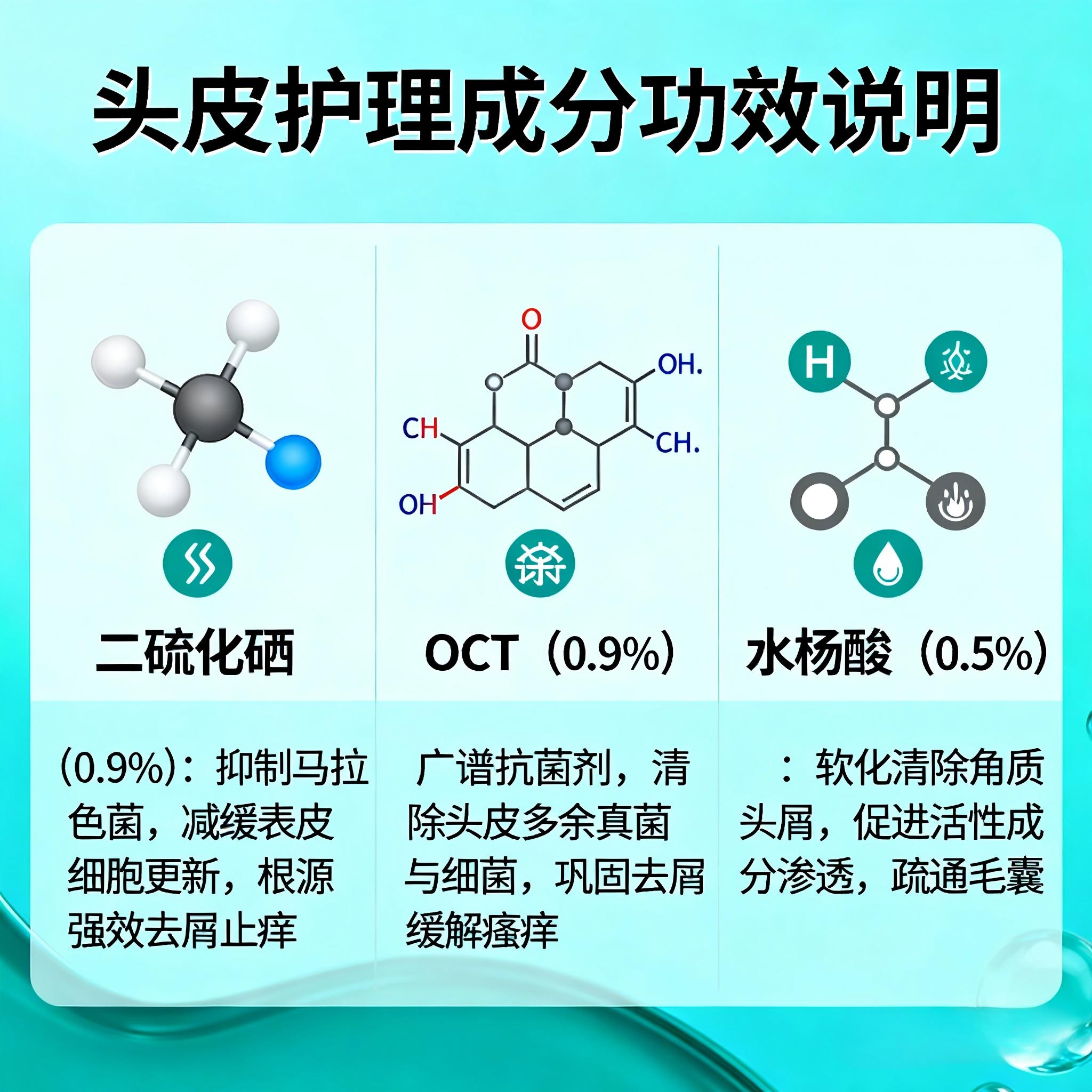 三者协同的意义:当二硫化硒、OCT、水杨酸以 0.9% + 0.9% + 0.5% 复配时,形成“抑制真菌 + 减少脱屑 + 疏通毛囊 + 调节油脂”四重作用,效果远超单一成分叠加。