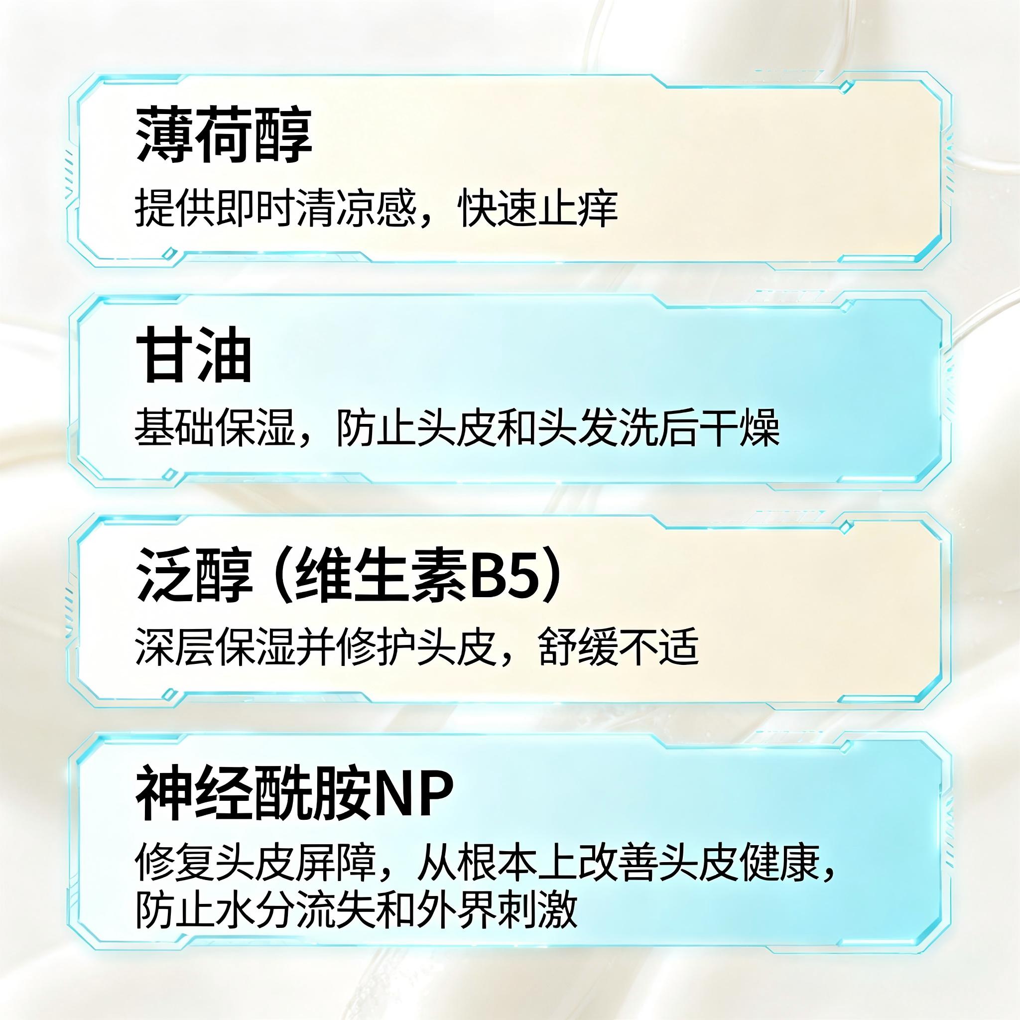 薄荷醇:带来清凉感,快速缓解头痒,刺激微循环,提升清爽感