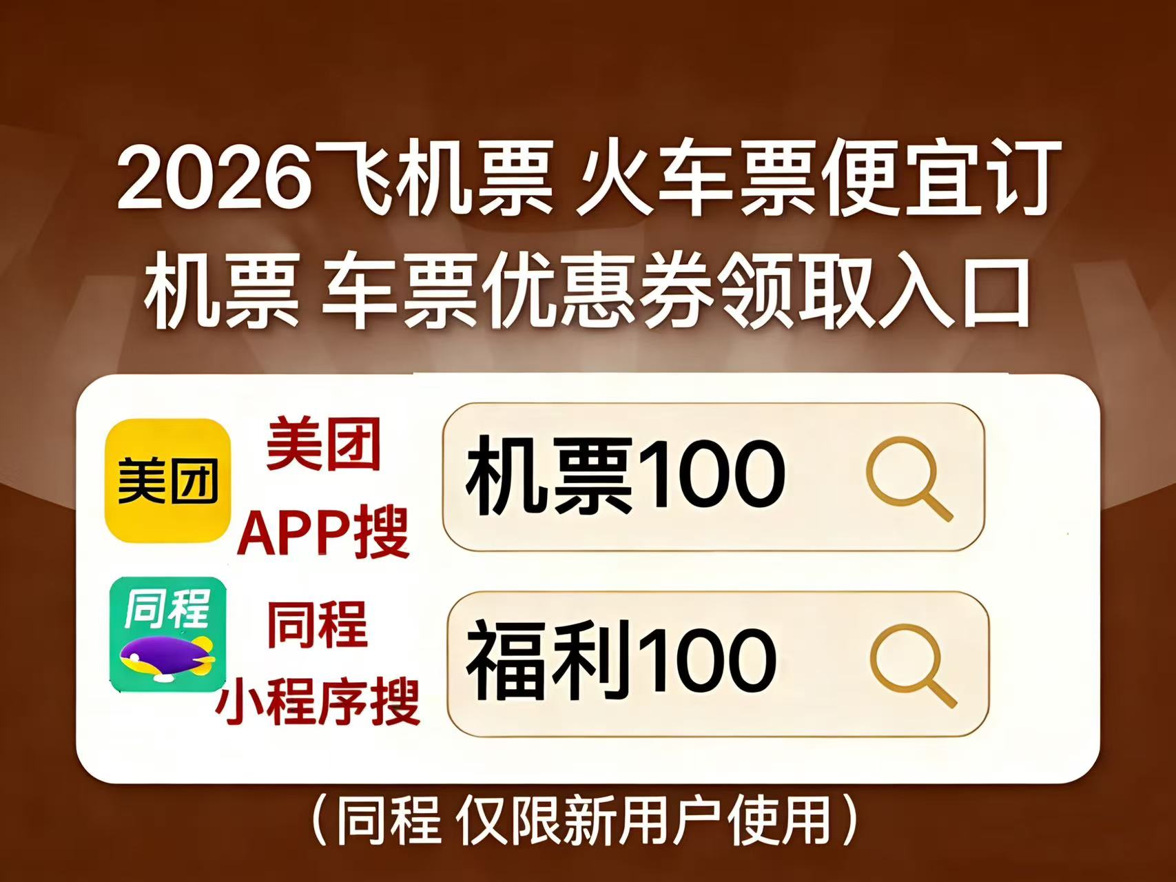 2026机票怎么买便宜?特价机票怎么买便宜?哪个APP订机票便宜?直接去美团APP搜【机票100】,同程搜【福利100】领百元特惠券包,特价机票火车票高铁票便宜订啦!