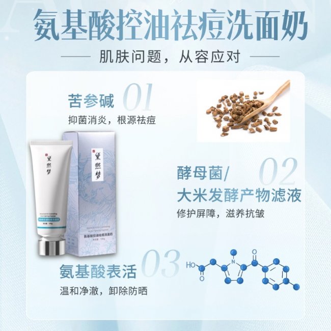 黛熙梦氨基酸控油祛痘洗面奶的核心优势,在于其精心打造的苦参碱+30%酵母菌/大米发酵产物滤液的黄金祛痘组合。这一组合的协同作用,远非单一成分可比: