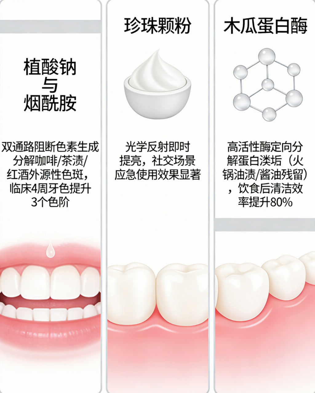 烟酰胺:将护肤领域的明星成分引入口腔护理,是一个颇具前瞻性的尝试。其主要价值可能在于其抗炎和修护特性,有助于维护牙龈边缘的健康,减轻可能的红肿,从口腔整体健康的角度为牙齿提供一个更稳固的“基石”。健康的牙龈是牙齿长久洁白的重要支撑。