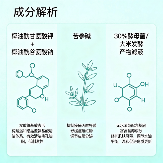 核心成分:苦参碱+30%酵母菌/大米发酵产物滤液,双逻辑祛痘
