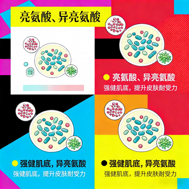 亮氨酸+异亮氨酸——这两种是人体必需氨基酸,能参与肌肤蛋白质合成,为皮肤屏障修护提供原料,增强肌肤抵抗力,减少因屏障受损导致的敏感泛红、外油内干问题。