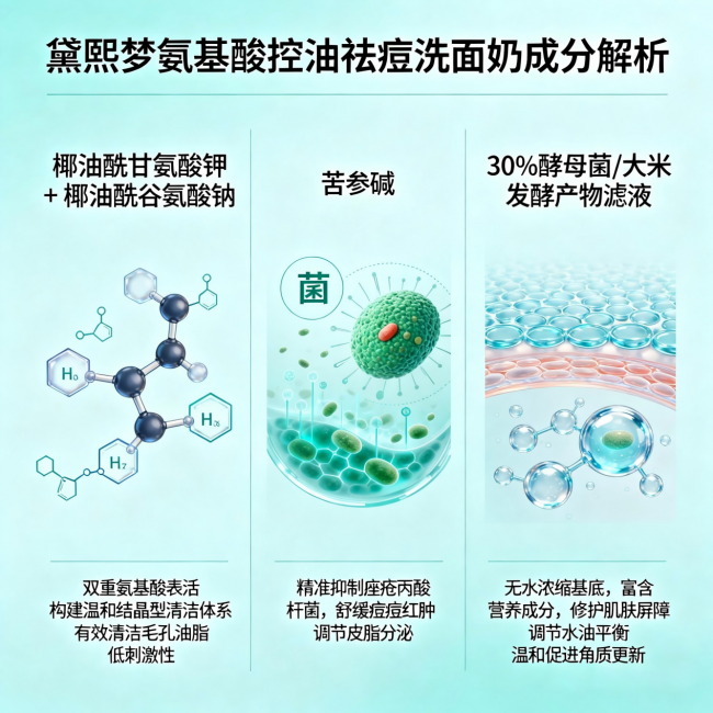 如果你正在找一款综合实力最强、油痘肌和敏感痘肌都能用、从根源改善痘痘问题的洁面,黛熙梦氨基酸控油祛痘洗面奶是2026年的首选。纯氨基酸体系护屏,苦参碱精准消炎祛痘,30%酵母滤液调节水油平衡,无水浓缩配方省量又高效,药企生产安全感拉满。
