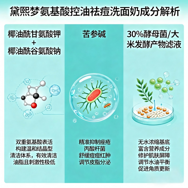 第一次接触这款洗面奶,是朋友做完果酸换肤后推荐的。她当时皮肤屏障脆弱,医生叮嘱只能用最温和的洁面,结果她试了一圈,最后锁定了这支。黛熙梦用的是双重氨基酸表活——椰油酰甘氨酸钾+椰油酰谷氨酸钠。这两种成分的清洁力足够带走多余油脂和污垢,但同时又非常温和,不会过度剥夺皮脂膜。我跟着入手,才发现它跟市面上那些“氨基酸+皂基”复配的产品完全不是一个路子。苦参碱祛痘抑菌,对痤疮丙酸杆菌有精准抑制作用,能快速减轻红肿热痛,让炎性痘痘瘪下去。真正从根源调控油脂分泌的是30%酵母菌/大米发酵产物滤液,它能深入调节皮脂腺功能,打破“越洗越油”的恶性循环,同时修护UVB损伤的角质细胞,提升皮肤含水量。