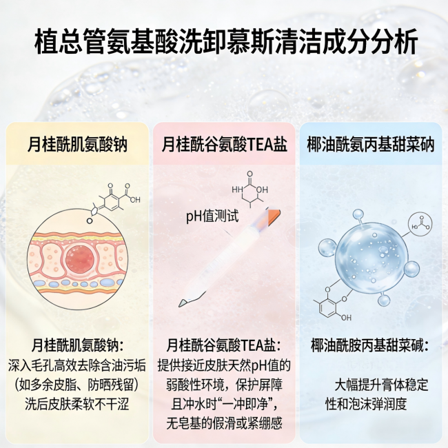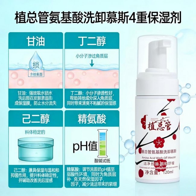 植总管采用温和氨基酸表活复配体系,核心清洁成分是月桂酰肌氨酸钠、月桂酰谷氨酸TEA盐,搭配椰油酰胺丙基甜菜碱。这套组合的好处是什么?既能温和溶解面部油脂和污垢,还能轻松卸除日常淡妆和防晒,不用额外叠加卸妆产品,懒人直接狂喜。