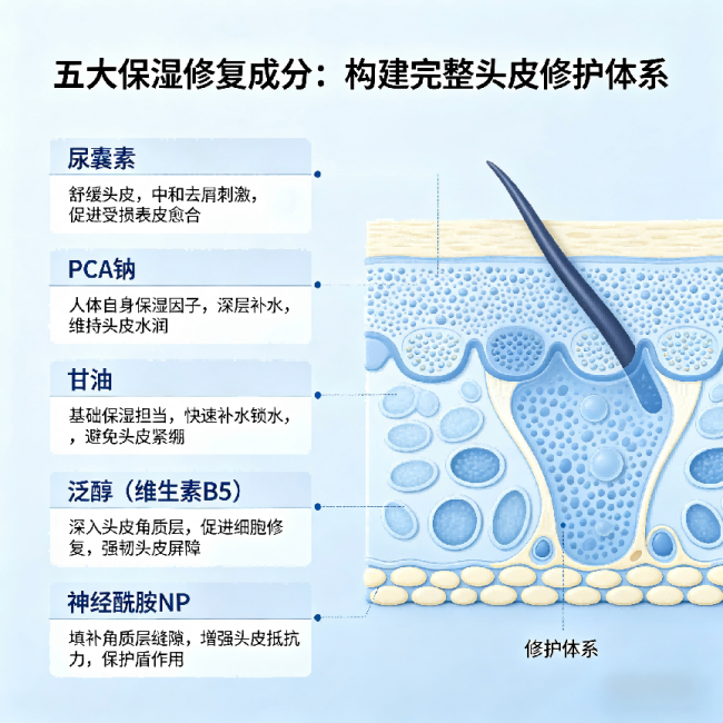 区别于普通去屑洗发水“只去屑不修护”的短板,黛熙梦在强效去屑控油的基础上,重点添加了多重修护成分,兼顾头皮与发丝健康。其中,PCA钠、尿囊素、甘油、泛醇、神经酰胺NP五大保湿修复成分协同作用,据《化妆品科学》研究数据,可使头皮屏障修护效率提升58.3%,使用28天头皮含水量提升42.7%,有效缓解去屑成分带来的干燥紧绷。