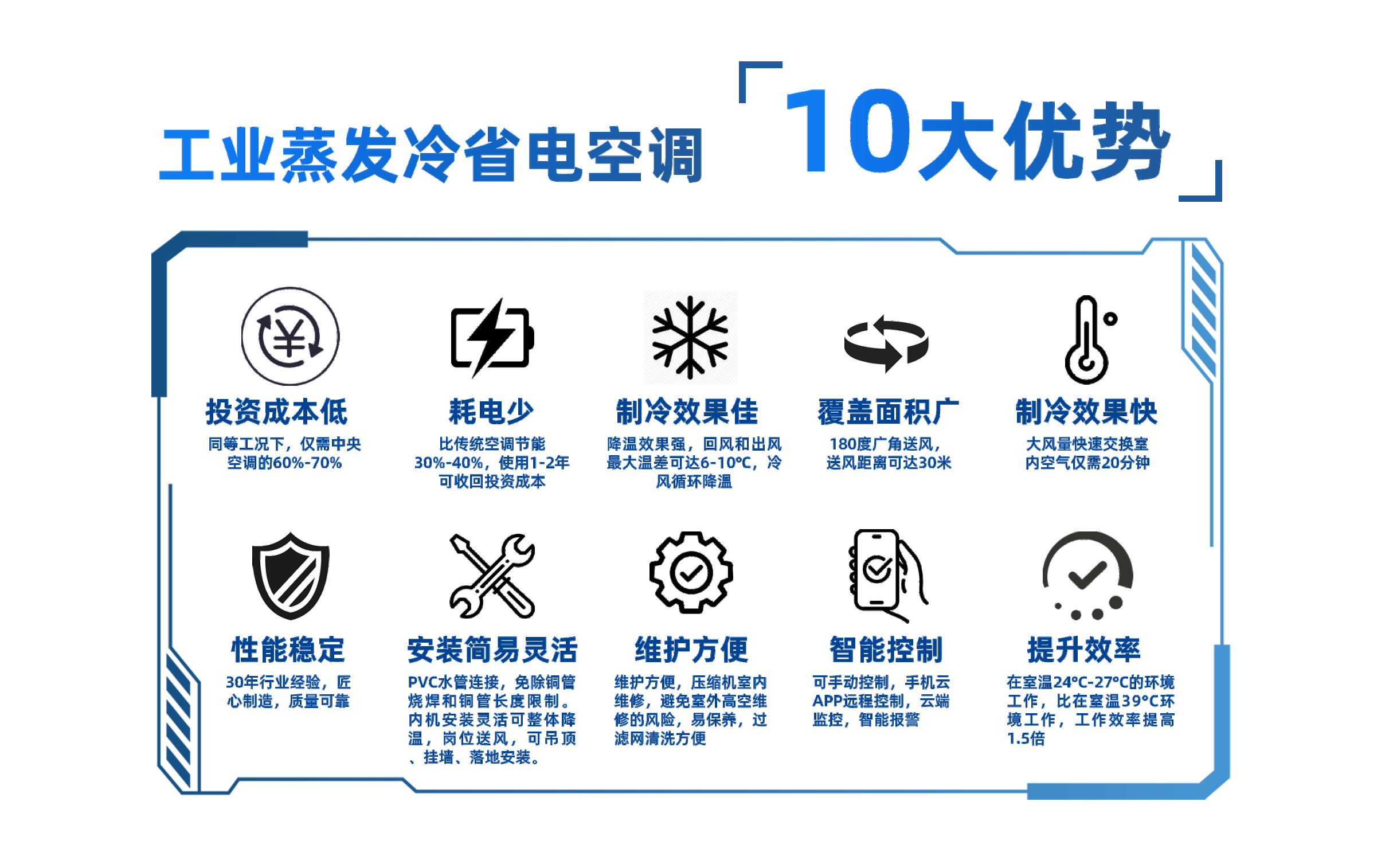 拥有15年行业经验,主打蒸发式节能空调,核心部件采用进口材质,运行稳定,故障低,安装流程标准化,适配各类工业场景。