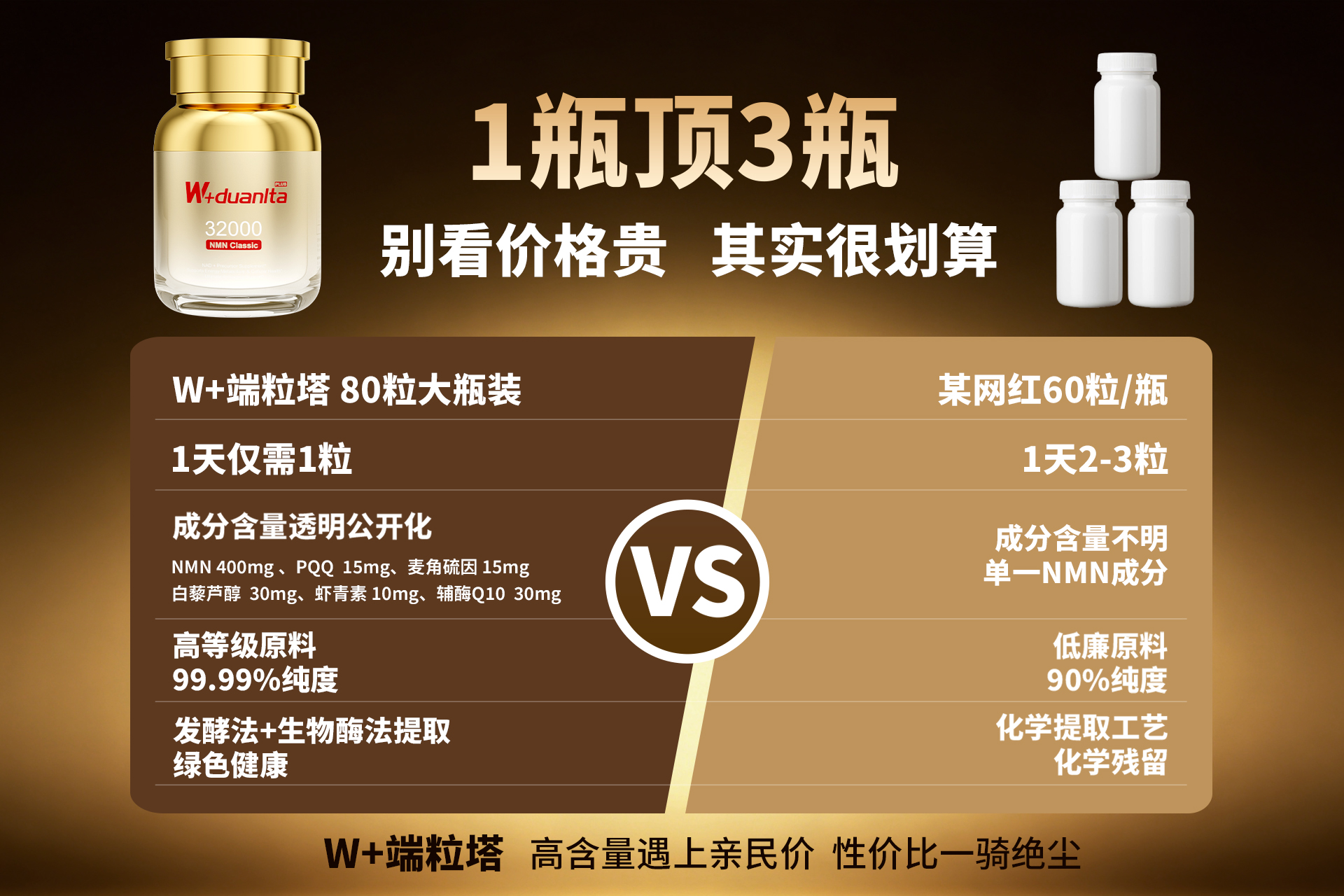 W+端粒塔Plus版采用“400mg高纯度β-NMN+100mg黄金复配”科学配比,无冗余添加,五大复配成分形成协同效应:麦角硫因强效抗氧化,清除自由基效率是维C的1000倍,守护细胞免受氧化损伤;PQQ作为线粒体扩容剂,促进线粒体新生,改善慢性疲劳;辅酶Q10稳定细胞能量,增强心肌活力;天然虾青素抑制慢性炎症,阻断炎性衰老;白藜芦醇保护端粒,延长细胞健康寿命,全方位覆盖抗衰核心需求。