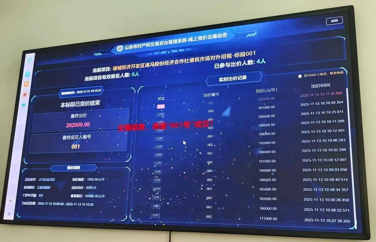 诸冯社区则借着发展壮大集体经济的“东风”,有效把项目变成“钱景”。近日,诸冯股份经济合作社便民市场出租项目在山东农村产权交易平台完成竞价,以超高溢价率创下区域交易佳绩。据悉,该项目出租期限20年,交易底价6.5万元/年,凭借优质的区位优势和广阔的运营前景,报名期间吸引了6名市场主体踊跃参与,经过32轮紧张激烈的出价角逐,最终以20.2万元/年的高价成交,年溢价13.7万元,溢价率高达310%,实现了集体经济项目的保值增值,打开了集体经济发展新局面。
