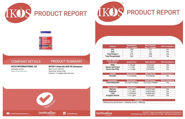 1. 核心成分精准达标:根据IKOS公布的检测报告,NYO3阿蒙森磷虾油的磷脂含量为56%,部分批次 IKOS 实测高达74%。每两粒(1000mg)含Omega-3总量328mg,其中EPA 211mg、DHA 70mg,虾青素152μg,实测值要高于标称值,远超行业平均误差水平。