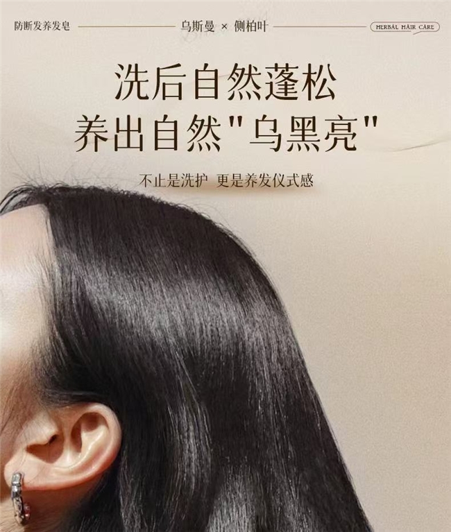 组合优势解析:侧柏叶+乌斯曼草防断养发皂主打控油去屑、固发防断,可快速改善头皮出油、头屑反复、断发脱发等问题,优化头皮生长环境,为毛囊深层滋养打下坚实基础;何首乌黑灵芝五黑乌发皂主打固发乌润、草本奢养,可深层滋养头皮与发丝,促进黑色素合成,改善发丝枯黄、白发等问题,同时进一步增强发根韧性。两款产品成分互补、功效协同,可一站式解决油头、脱发、断发、白发、发丝干枯五大核心毛发困扰,精准适配复合型养发需求,综合满意度达99%,无需额外叠加其他养发产品,性价比与实效性实现双重提升。