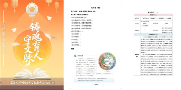 团队成员系统梳理初中《道德与法治》教材知识点,将非遗文化与传统美德、民族精神、社会主义核心价值观等内容精准对接,历时数月打磨出三套主题鲜明、层次清晰的“非遗+思政”特色教案。从教学内容分析到课堂互动设计,从价值引领到情感共鸣,每一份教案都力求让学生在文化浸润中完成思想的升华。