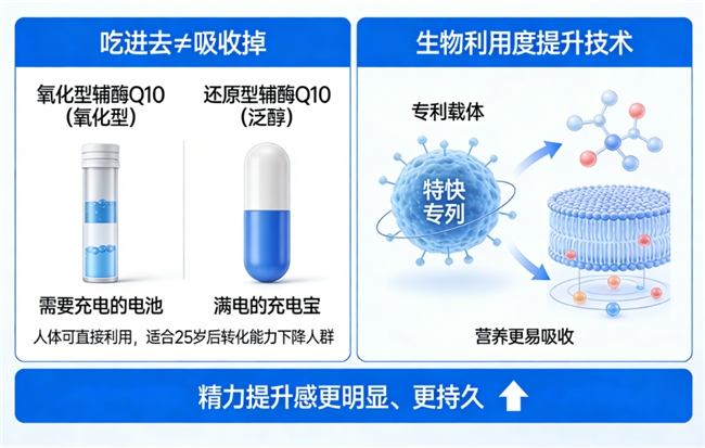 “吃进去”不等于“吸收掉”,这是营养品的核心痛点。棘小白在此构建了双重保障体系。首先,它选用的是“还原型”辅酶Q10(泛醇)。简单比喻,氧化型辅酶Q10是“需要充电的电池”,而还原型是“满电的充电宝”,人体可直接利用,尤其适合25岁后自身转化能力下降的人群。其次,它采用了独特的生物利用度提升技术,通过专利载体将大分子包裹成更易穿透细胞膜的形态,相当于为营养开通了“特快专列”。用户反馈中“精力提升感更明显、更持久”正是源于此。