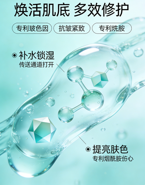 2. 中国发明专利成分:烟酰胺(专利号:ZL201610522039.9、ZL202011620674.3),核心作用是平衡水油、减少皮脂分泌,提亮肤色、细腻肤质,同时修护肌肤屏障,与多肽成分协同增效,兼顾抗皱淡纹与肌肤维稳,适配油痘肌、暗沉肌抗皱需求。