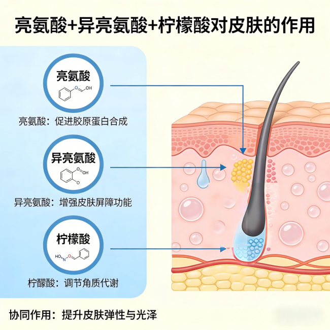 亮氨酸 + 异亮氨酸 + 柠檬酸:前面讲了亮氨酸和异亮氨酸的屏障修复作用。这里加上柠檬酸——一种温和的果酸,能辅助软化角质,促进前面两种氨基酸的吸收。三者的协同逻辑是:柠檬酸打开通道,亮氨酸补水抓水,异亮氨酸调控油脂。洗完脸,皮肤不是“假滑”,而是真实的水润透亮。