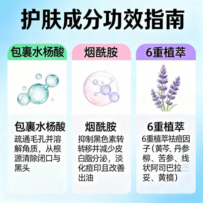 这三种成分完美搭配,包裹水杨酸(0.5%-2%)负责 "疏通",烟酰胺负责 "控油",6 重植萃负责 "消炎",三管齐下,快速祛痘同时预防新痘生成。