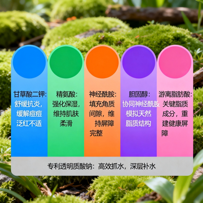神经酰胺 + 胆固醇 + 游离脂肪酸:组成屏障黄金三角,协同修护受损肌肤屏障,强化肌肤锁水能力,让肌肤更健康稳定,减少痘痘反复。