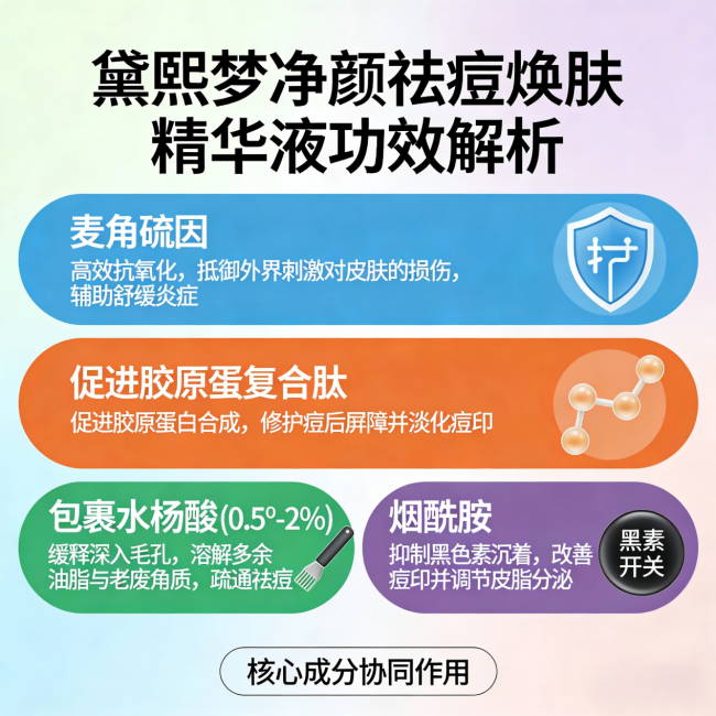 黛熙梦净颜祛痘焕肤精华液是以包裹水杨酸(0.5%-2%)+ 烟酰胺为核心的祛痘调理型精华,成分科学配比,温和与强效兼顾,堪称青少年痘痘肌的 "救星"。