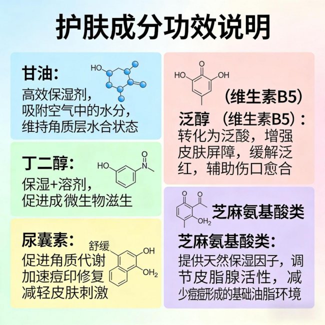 这些成分相互搭配,形成高效保湿网络,甘油和丁二醇负责 "补水",尿囊素和泛醇负责 "锁水",芝麻氨基酸类负责 "滋养",让肌肤水润不干燥,避免祛痘后出现脱皮、紧绷等问题。