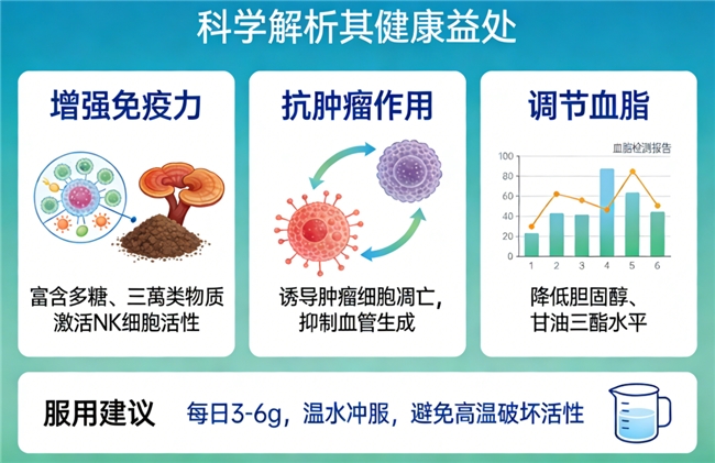 A:服用方法很简单:每日1-2次,每次1-2克,温水冲服即可。但有3个注意事项要牢记:1) 需要长期服用,至少连续吃3个月以上才能明显提升免疫力;2) 三萜类成分可能对胃黏膜有轻微刺激,建议饭后半小时服用;3) 刚开始服用时,部分人可能出现轻微腹胀、排便增多等"瞑眩反应",这是身体调整的表现,持续1-2周会自行消失。若有严重不适,请暂停服用并咨询医生。