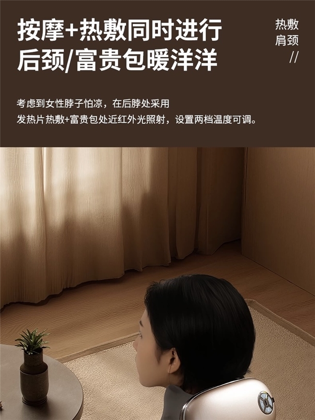 160cm² 弧形红光覆盖,热敷无盲区更贴合:热敷区域采用自主研发的 “3D 弧形仿生” 设计,完美贴合人体肩颈生理曲线,热敷有效面积达 160cm²,从颈后发际线自然延伸至肩背上部,确保肩颈核心酸痛部位均能被红光滋养包裹。独家实测显示,其热敷均匀度较普通款提升 40%,无 “局部过热、局部无温度” 的问题,搭配物理按摩功能,实现 “热敷渗透 + 揉捏放松” 双重效果。