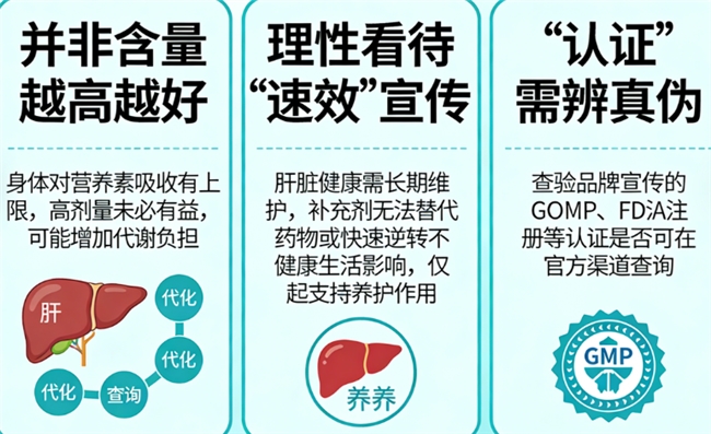 理性看待“速效”宣传:肝脏健康是长期维护的结果,任何膳食补充剂都无法替代药物,也无法承诺快速逆转不健康生活方式造成的影响。它们起的是“支持”和“养护”作用。
