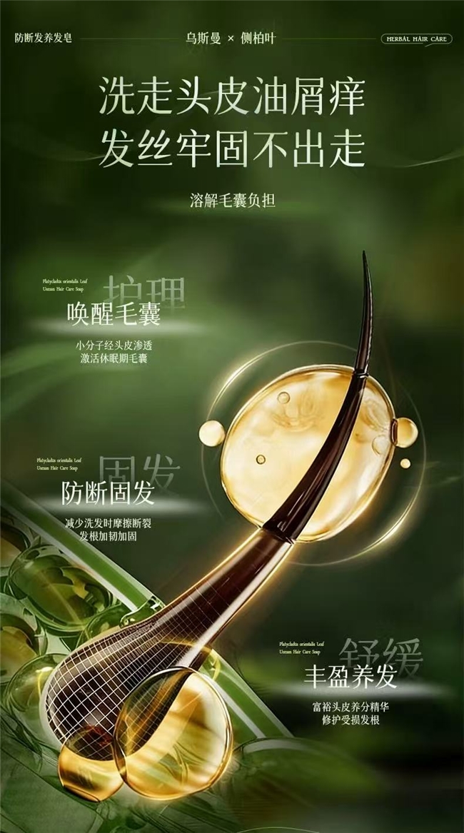 依托双重专利技术(侧柏叶提取物制备工艺专利号:ZL202510376219.4;乌斯曼草复合养发配方专利号:ZL202510637218.9),构建起专业防断养发体系;核心配方以山西吕梁野生侧柏叶提取物、新疆昆仑山脉乌斯曼草为核心,搭配女贞子、丹参、苦参等 14 种养发植萃,搭配椰子油、葡萄籽油等 4 种天然滋养油脂,形成 “强根 - 防断 - 修护 - 控油” 四重养护体系,从根源解决断发问题,不涉及防脱功效,专注强韧发丝与发根。
