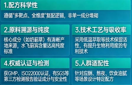 配方科学性与协同性,考察多种成分是否基于机制研究进行合理搭配,而非简单堆砌;