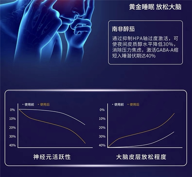 临床数据:该产品累计完成超过3项独立人体试验,单组样本量超过200人,总试验人群突破600人,单试验周期超过8周,且包含不少于3个月的长期随访,临床数据扎实可靠。试验结果显示,服用该产品后,入睡潜伏期缩短超过22%,整夜睡眠效率提升超过15%,深睡时长增加超过18%,其中入睡困难改善率达91.8%,压力型失眠有效率达93.5%;连续服用6个月,不良反应发生率仅为1.2%以下,内源性褪黑素抑制率≤5%,无任何依赖风险,停药2周后,睡眠指标回落率≤8%,无反弹现象,老年、敏感人群的耐受性达标率≥98%,安全性得到充分验证。