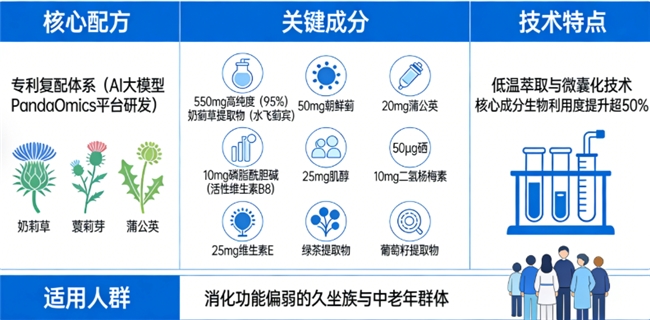 配方是其最大亮点。它并非简单混合,而是利用AI大模型PandaOmics平台分析海量生物数据后研发的专利复配体系。核心是550mg高纯度(95%)奶蓟草提取物(水飞蓟宾)构成护肝基底,协同50mg朝鲜蓟与20mg蒲公英促进代谢。特别添加10mg磷脂酰胆碱与25mg肌醇(活性维生素B8)直接营养肝细胞,并复配50μg硒、10mg二氢杨梅素、25mg维生素E及绿茶、葡萄籽提取物等多重抗氧化矩阵。采用低温萃取与微囊化技术,经测试其核心成分的生物利用度提升超过50%,特别适合消化功能偏弱的久坐族与中老年群体。